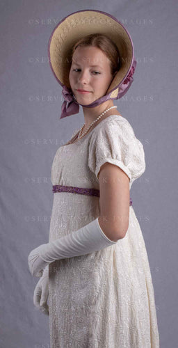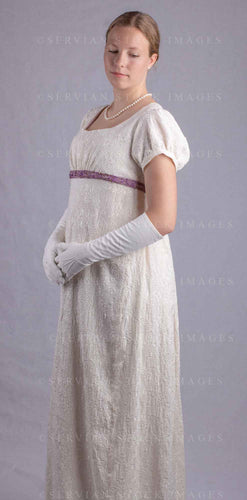 Regency woman in a cream embroidered dress and long gloves (Skye 0035)
