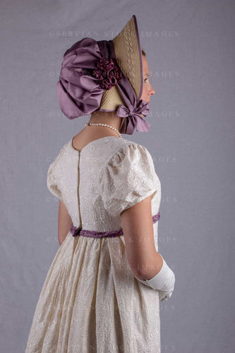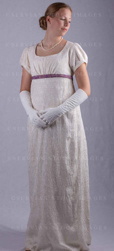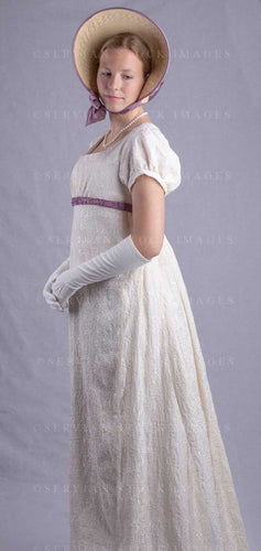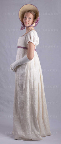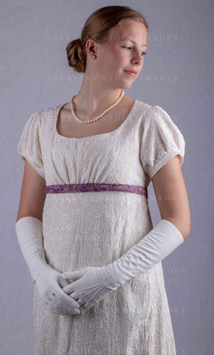 Regency woman in a cream embroidered dress and long gloves (Skye 0027)