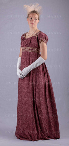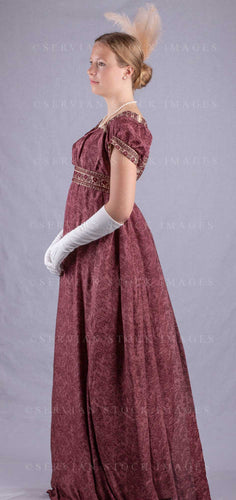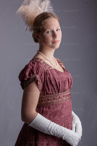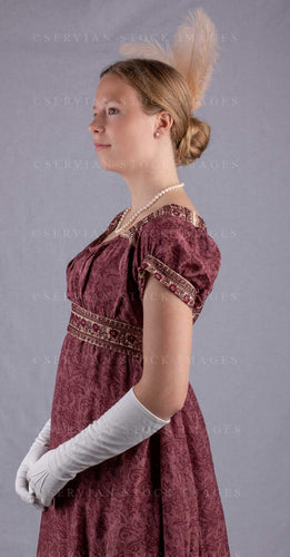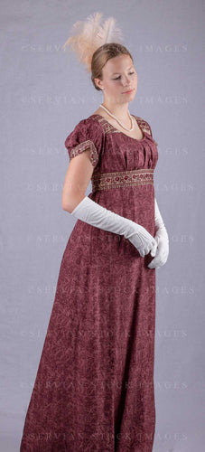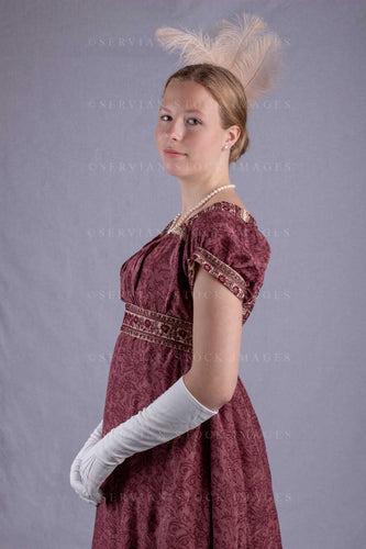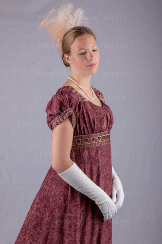 Regency woman wearing a red silk embroidered dress and long gloves (Skye 0093)