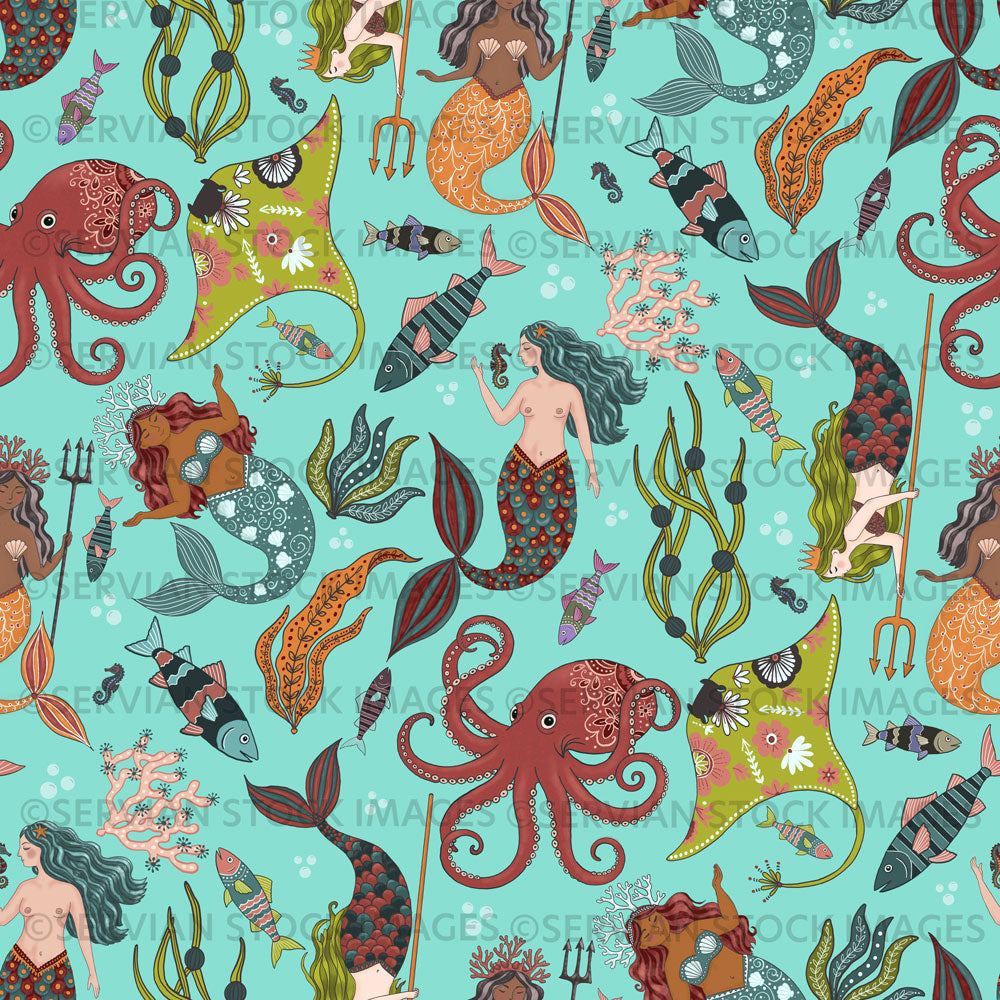 Mermaids 1 is a hand-drawn design with no AI used. You are purchasing the right to non-exclusive use of this pattern for personal and commercial projects up to 5000 products. If you expect to create more than 5000 products, please contact me to discuss purchasing an extended licence.